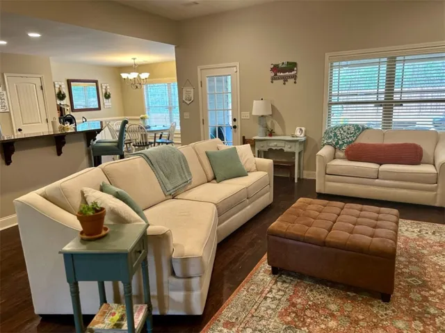 Open living area and kitchen with real hardwood floors. Kitchen has granite countertops, dishwasher, pantry, and plenty of cabinet space.