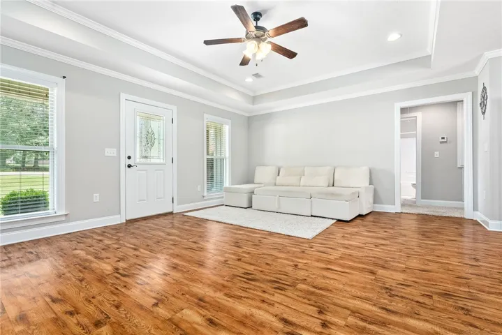 Welcome to 5971 Cherokee Trail, a beautifully maintained home offering a perfect blend of comfort, style, and functionality in the heart of Tallassee. Step inside to discover a light-filled, open-concept layout with gleaming hardwood floors flowing through the main living areas. The spacious living room, complete with tray ceilings and a ceiling fan, provides a welcoming atmosphere for relaxing or entertaining. The kitchen is a true highlight, featuring rich wood cabinetry, stainless steel appliances, subway tile backsplash, and a large center island perfect for meal prep and gathering. A separate dining area with a modern farmhouse-style light fixture completes the space. This home offers multiple bedrooms with neutral tones, plush carpet, and large windows that fill each room with natural light. The primary suite is a private retreat with a tray ceiling, a generous walk-in closet, and an en-suite bathroom showcasing a double vanity, granite countertops, and a shower/tub combo. Additional bedrooms are versatile and well-sized, perfect for guests or a home office. Outside, you’ll enjoy the charming curb appeal with a covered front porch and a spacious backyard with plenty of room for outdoor living, entertaining, or play. Conveniently located just minutes from local schools, shopping, and dining, this home offers both privacy and accessibility.