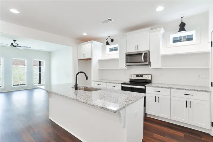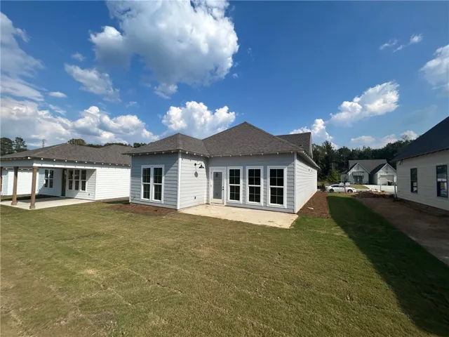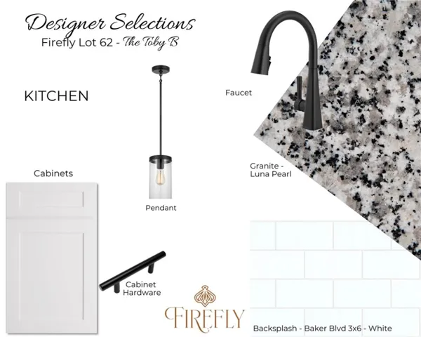 Quick Move-In Designer Home! November 2025 Closing – The Toby B floor plan is a beautiful 3 bedroom, 2 bath home, at 1391sq ft and includes a single car garage. The entry porch opens up into a foyer with access on one side to the linen closet and two guest bedrooms with a shared full bathroom. In the foyer, you also have access to the garage and laundry room. From the foyer, you enter into the open concept kitchen, living, and dining areas. The kitchen features a large island with plenty of cabinet space & floating shelves. Through the kitchen we find the living room filled with natural light from the large windows. The Owner’s Retreat sits at the back of the home and features a private en-suite with a walk in tile shower, and a large walk in closet. This Toby plan will feature an 11×7 concrete pad for your back patio.