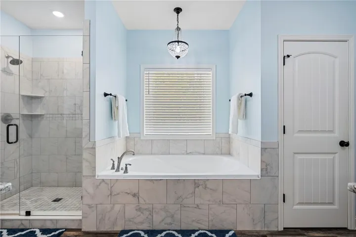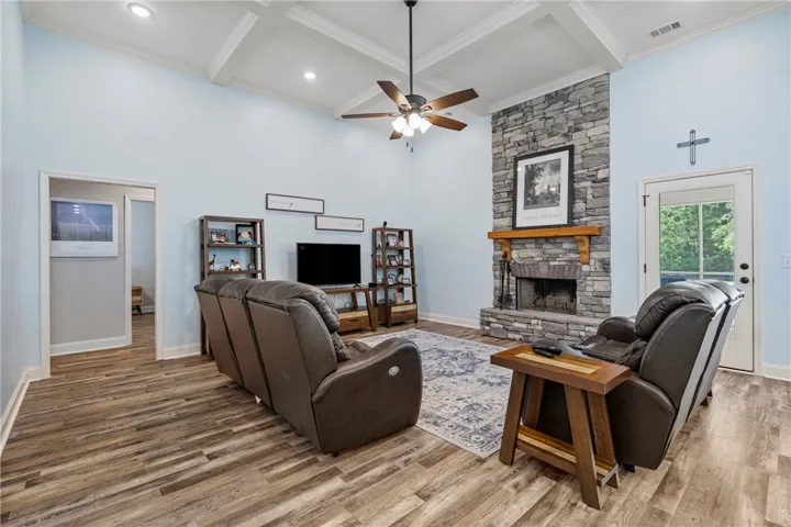 Nestled on 5 private acres, this stunning craftsman-style home with black windows, stone accents, and cedar details offers the perfect blend of luxury and country living. A grand entrance with a deep covered front porch welcomes you inside, where you’ll notice gorgeous LVP flooring that flows throughout. The spacious living room features floor-to-ceiling stacked stone wood-burning fireplace, serving as the centerpiece of the open floor plan. The eat-in kitchen is a showstopper, complete with an oversized island, stainless steel appliances, subway tile backsplash, granite countertops with a leathered finish on the island, and an incredible walk-in pantry. The pantry provides extra storage with built-in cabinetry, butcher block counters and custom shelving. The owners suite is located on the main level. The master bathroom features a soaking tub, separate tiled shower, dual vanities with additional cabinetry, and enormous walk-in closet that conveniently connects to the spacious laundry room. The laundry includes granite countertops, a sink, abundant cabinetry, and is accessible from both the master suite and the mudroom/drop zone off the garage. The split floor plan offers three additional bedrooms on the main level, each with ample closet space, as well as a large secondary bathroom with dual vanities. Upstairs, you’ll find a versatile bonus room with a full bath.The screened-in back porch, complete with a cozy fireplace, is perfect for morning coffee. Beyond the porch, the sparkling saltwater pool invites you to relax and soak up the sun. The large patio and beautifully maintained fenced yard offers plenty of room for entertaining. Whether hosting summer parties, floating the day away, or enjoying a quiet evening by the fire, this backyard feels like a vacation without ever leaving home. Extras include blown-in insulation for enhanced energy efficiency and comfort year-round, specialty ceilings, an upgraded trim package, and thoughtful finishes throughout.