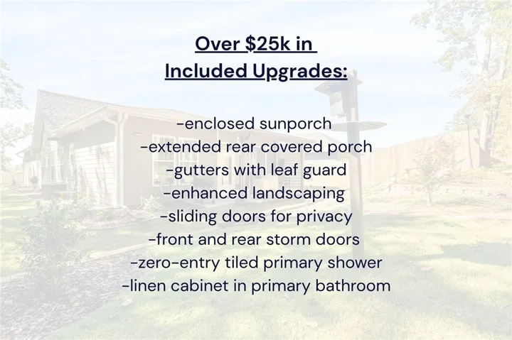 $2,500 SELLER CREDIT IF CLOSED IN 2025 + UP TO $2,500 LENDER CREDIT WITH WILL HERRING AT CMG! Over $25k of upgrades have been added throughout this home making it stand out from standard new construction. Outdoor living is a highlight here. Whether you’re relaxing in the enclosed sunroom, hosting on the covered back porch, or enjoying the gorgeous landscape surrounded by trees on two sides. Enjoy peace of mind with features such as irrigation, covered gutters, and storm doors on both the front and back. Inside, you’ll love the upgraded finishes, including custom sliding barn doors that separate the secondary bedrooms and a built-in linen cabinet in the primary bath for extra storage. Unlike many homes in this neighborhood, this property includes a spacious 2-car garage, a rare and valuable feature. Tucked away at the end of the street, this property offers the best of both worlds: the appeal of a brand-new build with valuable extras already completed for you. Move right in and start enjoying the serene setting and thoughtful touches that make this home truly special.
