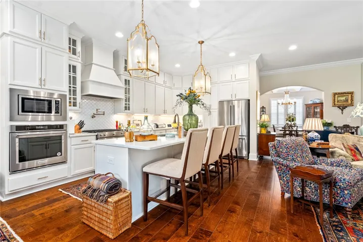 A two-car garage with custom cabinetry, in-ground sprinkler system, and designer lighting by Circa and CopperSmith complete this home’s timeless appeal.