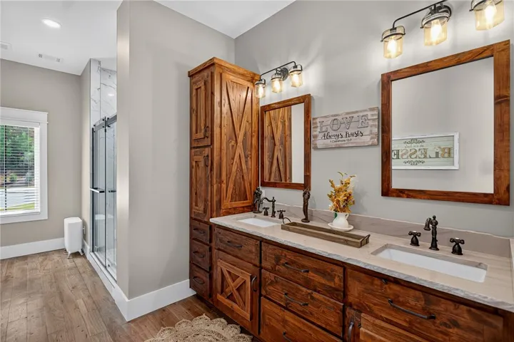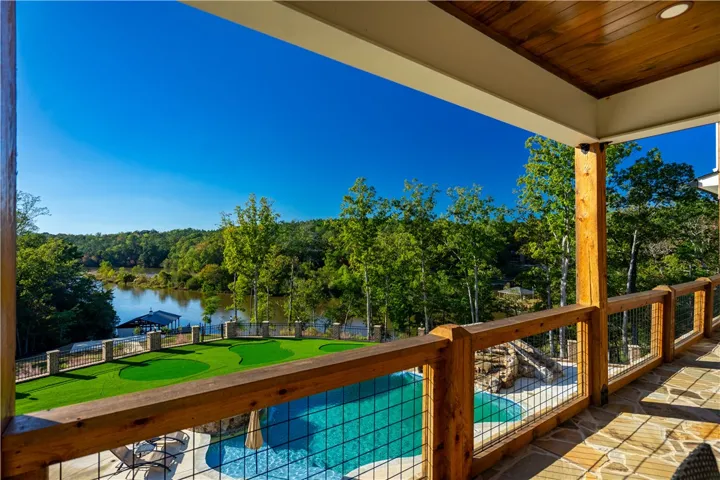 Perfectly positioned on 7.08 deeded acres at the mouth of Mountain Oak Creek, this custom-built retreat offers 4,328± heated square feet of pure perfection Over 90,000 pounds of hand-selected Tennessee stone. Step inside to soaring ceilings, rich hickory floors, and a 10½-foot-wide stone fireplace that anchors the great room. Sliding glass doors open fully to bring the outdoors in, framing panoramic lake views. The inset TV with surround sound and remote shade screens create the ultimate entertaining environment. Enjoy comfort and craftsmanship, from the live-edge cedar mantle to the stone-accented back deck with a gas firepit, bar area, and 98” outdoor TV. The custom kitchen boasts a 5’x7’ hickory island with seating for four, quartzite countertops, farmhouse sink, commercial-grade Frigidaire refrigerator/freezer, Schott range with vent hood, built-in microwave, LG dishwasher, ice maker, and double built-in trash bins. A pass-through window connects to the dining room, while the walk-in pantry with barn doors, cedar shelving, and walls adds both function and beauty. The main-level owner’s suite is a peaceful retreat, featuring quartzite countertops, double vanity, large walk-in closet, and a spa-inspired tiled shower. A loft-style office above provides inspiring lake views. Downstairs, enjoy 10-foot ceilings, three spacious bedrooms, and two full baths — including a double-vanity suite and tub/shower combo bath. Laundry hookup, hickory floors, tile baths, wood ceilings, and a stone fireplace make this level ideal for guests or multi-generational living. The Upstairs patio overlooks the pool area and contains a large 98” TV that lets down, gas fire-pit, Quartzite bar area, and surround sound. The outdoor entertainment continues with a fold-down TV, stone patio, and concrete steps leading to your private dock and a future-ready 16’x35’ gazebo/fire pit area. Step outside to discover your personal paradise — SEE ADD’L INFO UNDER AGENT REMARKS